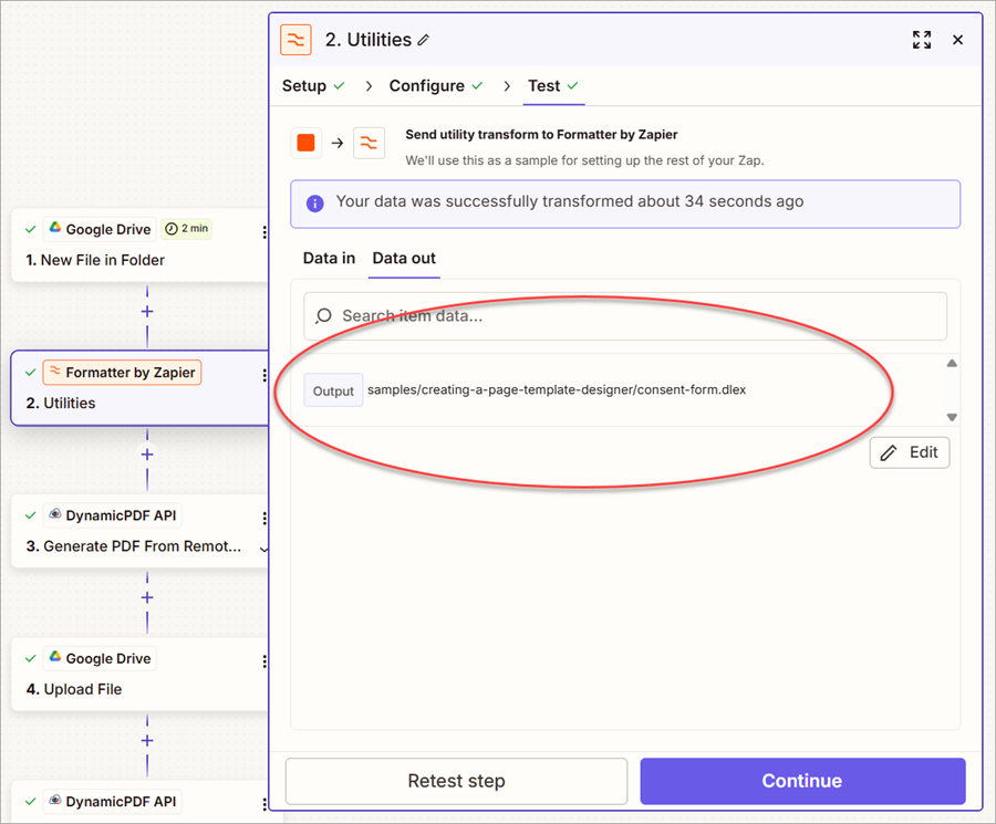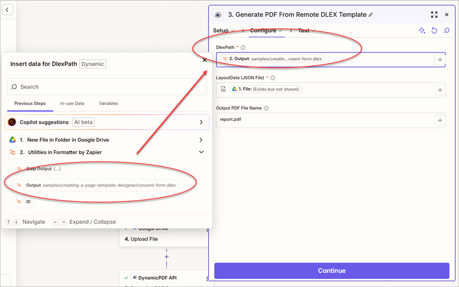- Modify the 3. Generate PDF From Remote DLEX Template step so that the DlexPath is mapped to the Output from the 2. Utilities in Formatter by Zapier step.