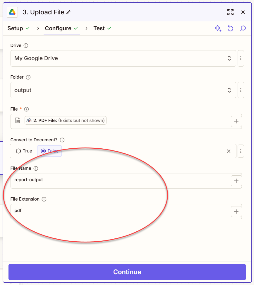 Note that the 3. Upload File In Google Drive step for the generated report also hardcodes the File Name and File Extension. This obviously will overwrite any produced report when used in an active Zap. Let's modify it to provide values dynamically.