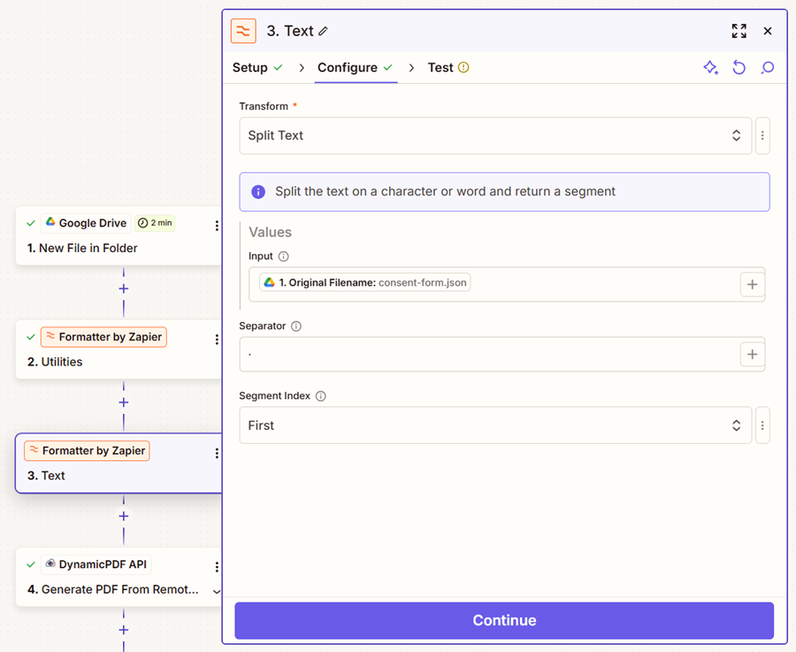 - Add a Formatter by Zapier step between 1. New File in Folder in Google Drive and the 2. Generate PDF From Remote DLEX Template steps.