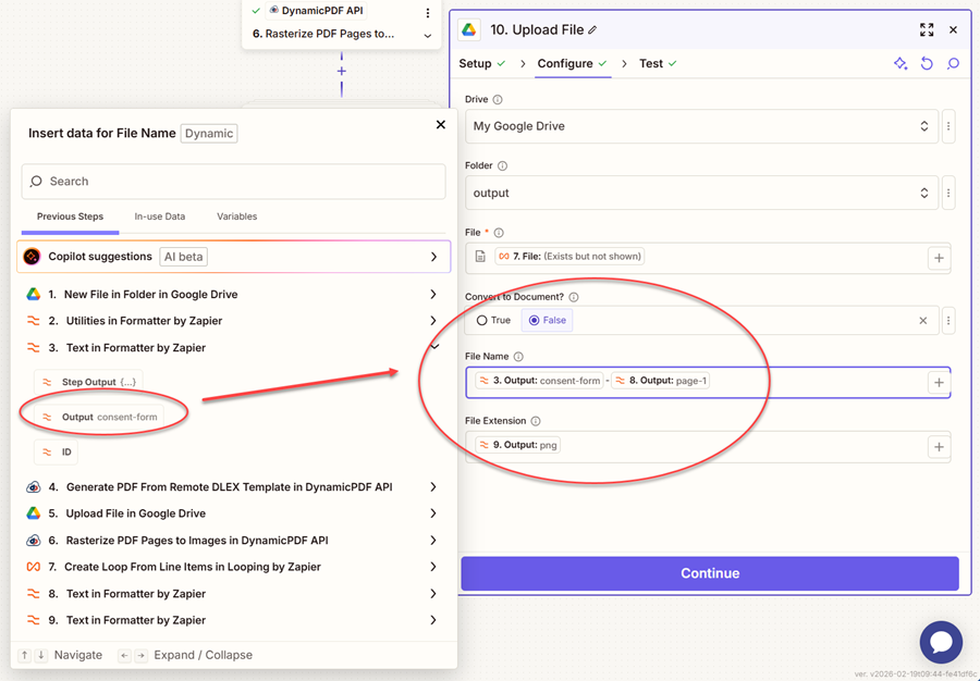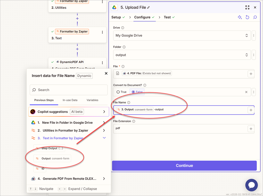 - Modify the 5. Upload File in Google Drive step so that the File Name is dynamically created from the Output returned from the 3. Text in Formatter by Zapier step and the word