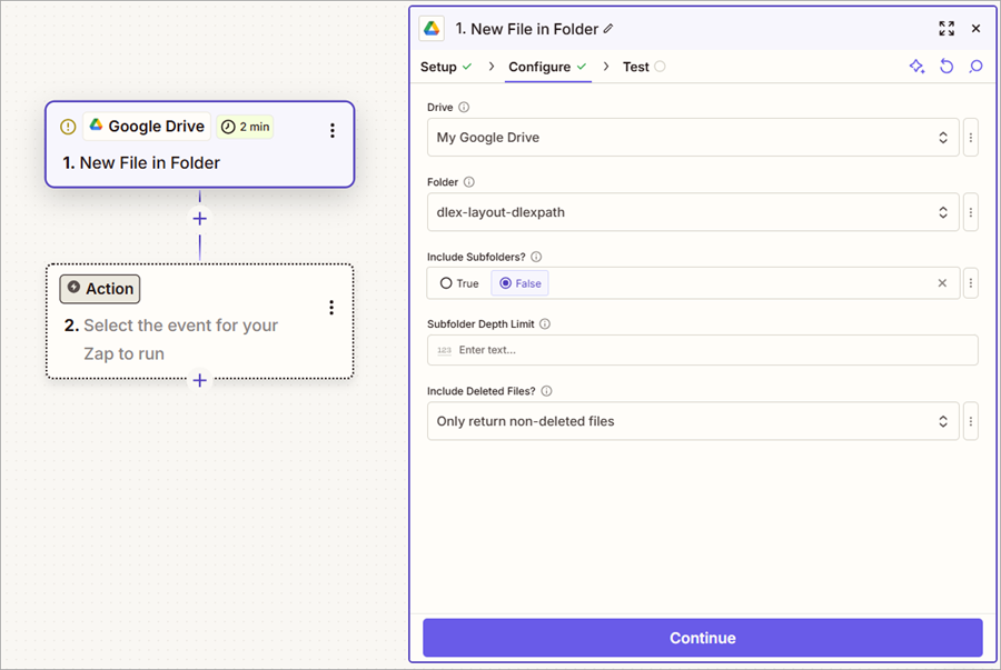 Note that the original trigger is configured to run every two minutes, checking for a new file in Google Drive and processing the file it finds. However, in the Generate PDF From Remote DLEX Template step, the DlexPath field is hardcoded.