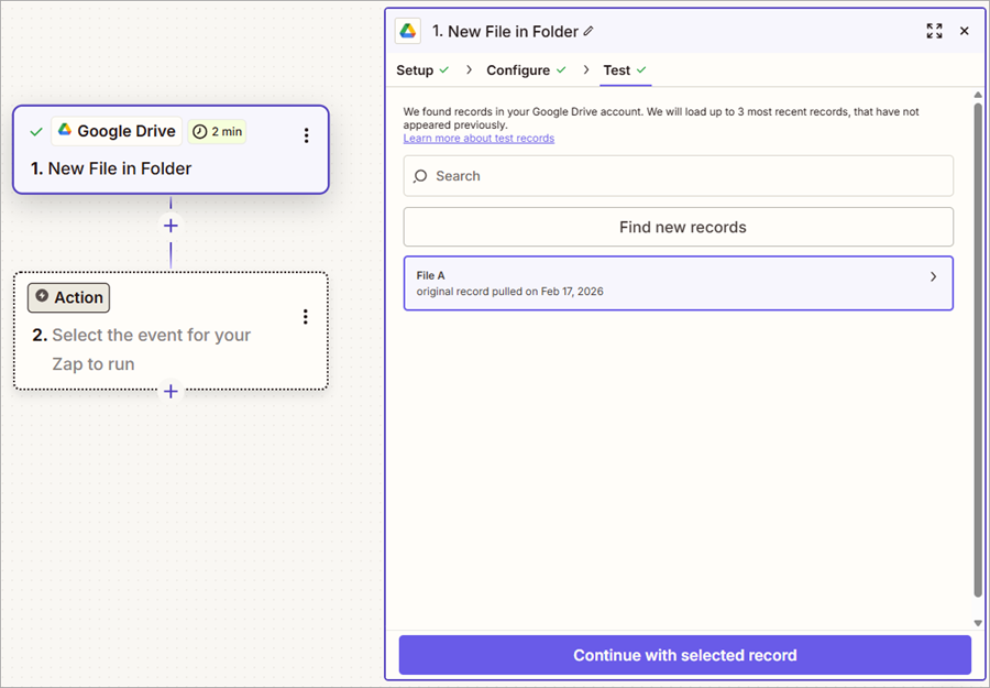 - Select Find new Records to find the file in Google Drive.