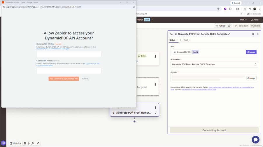 - Enter your DynamicPDF API key and assign a name for the connection.
