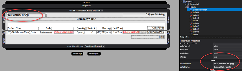 The first thing to notice is that the report's header uses the CurrentDateTime() function to return the report's date by adding the function to the dataName property of a RecordBox instance. It also applies formatting by specifying dddd, MMMM dd, yyyy in the element's dataFormat property.