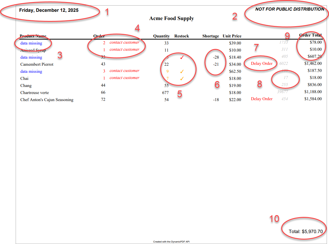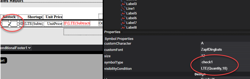 The report also checks to see if the Priority flag is true, if true and there is a shortage then it adds text indicating the customer should be contacted as they are a priority customer IF(LTE(Subtract(Quantity,OrderAmount), 0) & Priority,"Delay Order").