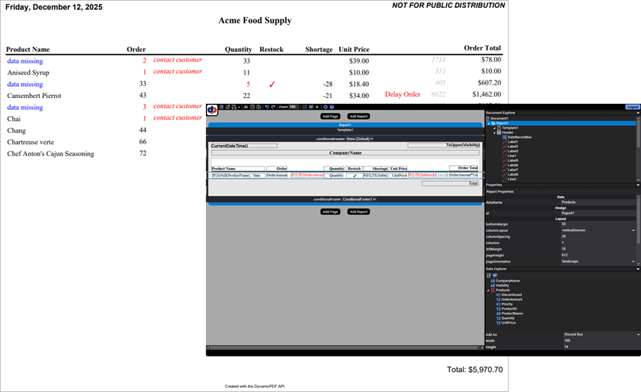 Use expressions and formulas in DynamicPDF Designer.The DynamicPDF Designer, included with the DynamicPDF API, is a graphical tool for creating PDF reports visually. In this example, you use expressions in a simple report to illustrate Designer's ability to add expressions to customize report data.