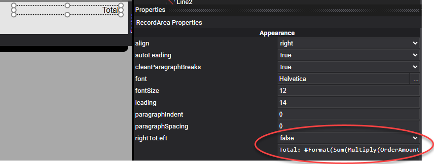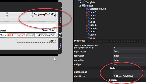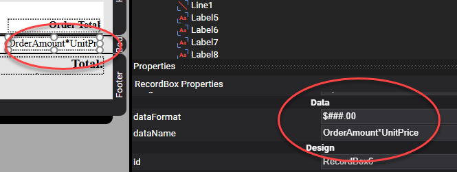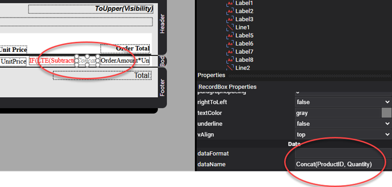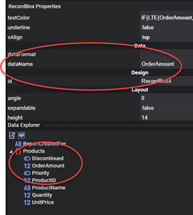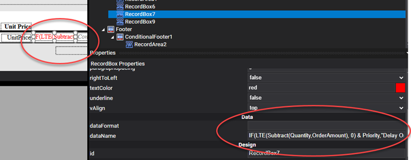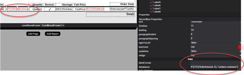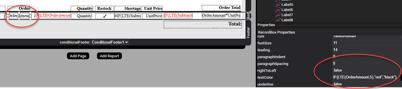 The report contains a RecordBox for the OrderAmount data element. If the OrderAmount is less then or equal to five, then make the text red by entering IF(LTE(OrderAmount,5),"red","black") expression in the textColor property.