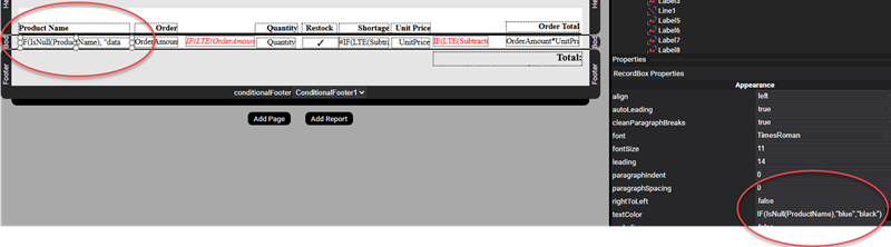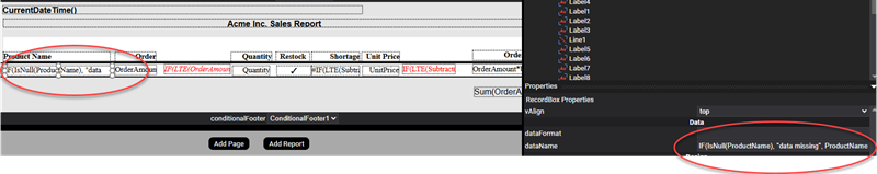 The report contains a RecordBox element where the dataName is an expression. This expression also checks for a null ProductName value IF(IsNull(ProductName), "data missing", ProductName) and replaces the missing value with data missing. The element also adds an expression to the textColor property, where when missing the text's color is blue otherwise it is black IF(IsNull(ProductName),"blue","black").