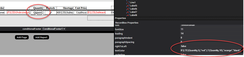The Quantity data element lists how many items are available in stock. If there are between ten and five items, then make the text color orange, if it is less than five then make it red, otherwise make it black IF(LTE(Quantity,5),"red",LT(Quantity,10),"orange","black").