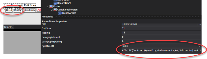 The report displays the shortage when a quantity ordered is more than the amount available in stock. It subtracts Quantity from OrderAmount and if negative it displays the shortage #IF(LTE(Subtract(Quantity,OrderAmount),0),Subtract(Quantity,OrderAmount))#.